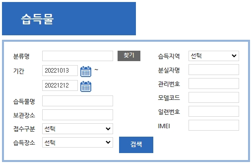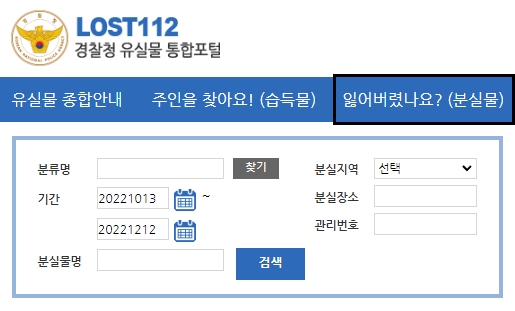 분실물 검색메뉴는 분실자들이 자신의 분실물을 신고한 내역을 보여줍니다. 분실신고되어있는 물품을 습득하여 보관하고 있다면 관할관서로 즉시 연락 및 제보해주세요.