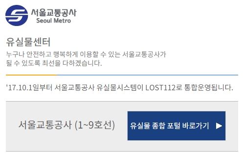 서울교통공사 홈페이지에 접속하여 유실물센터 페이지로 들어가보면 위의 그림처럼 지난 2017년 10월 1일부터 LOST112로 통합운영되고 있다는 메시지가 나옵니다.