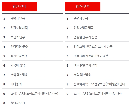 납부마감일 등 전화가 많이 집중될 경우에는 업무시간 내라도 상담사 연결이 어려울 수 있으며, 일시적으로 셀프서비스만 안내받을 수 있습니다. 업무시간 내/외 ARS 단축번호는 아래 그림을 참고하세요.