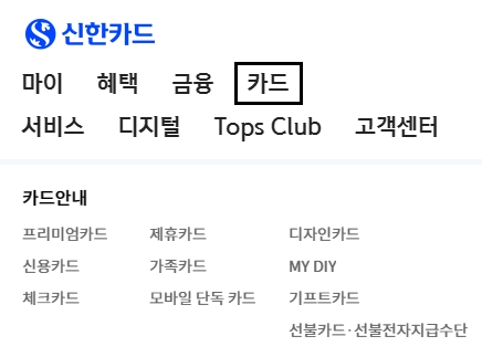 신한카드 홈페이지의 메인화면 상단 [카드] 메뉴를 선택하고 [카드안내] 영역에 있는 [가족카드] 항목으로 들어가서 신용 및 체크카드 종류를 확인할 수 있습니다.