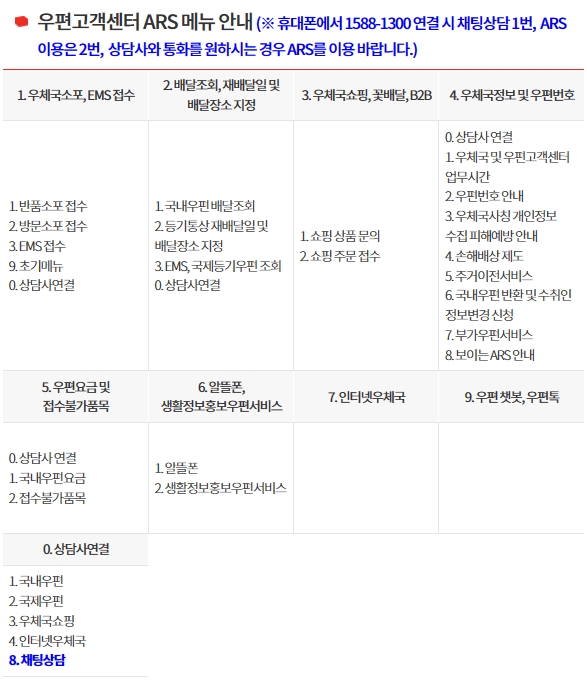 ARS 1번은 우체국소포/EMS접수, 2번은 배달조회/재배달일 및 배달장소 지정, 3번은 우체국쇼핑/꽃배달/B2B, 4번은 우체국정보 및 우편번호, 5번은 우편요금 및 접수불가품목, 6번은 알뜰폰/생활정보홍보우편서비스, 7번은 인터넷우체국, 9번은 우편챗봇/우편톡, 0번은 상담사연결입니다.