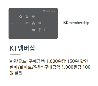 VIP 및 골드등급의 경우 구매금액 1천원당 150원 할인혜택이 있고, 실버/화이트 및 일반등급의 경우 구매금액 1천원당 100원 할인혜택이 있습니다. 1일 1회까지 사용가능하고, 1회 최대 20만원까지만 할인이 적용됩니다. SKT와 비교하면 VIP/골드를 제외한 등급에서는 KT조건이 더 좋네요.