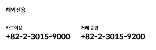 외국인회원 상담편의 서비스번호는 1899-6111번이고, 외국인 회원을 위한 영어 상담 편의 서비스를 제공하며, 운영시간은 평일 09시부터 18시까지입니다. 해외전용으로는 카드이용 관련번호가 +82-2-3015-9000번이고 평일 09시~18시까지, 거래승인 관련번호가 +82-2-3015-9200번이고 도난/분실/거래승인 업무를 365일 24시간 서비스합니다.