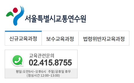 교육과정으로는 신규, 보수, 법령위반자 교육과정이 있습니다. 신규는 법인택시 신규채용자, 버스 신규채용자 교육과정이 있습니다. 보수는 법인택시, 개인택시, 화물계열, 전세/특수, 마을버스, 고속버스, 외국인 관광택시 보수교육과정이 있습니다. 법령위반자는 법인택시/버스/화물 법령위반자교육이 있습니다. 교육관련 문의번호는 02-415-8755번이고, 이용시간은 평일 09시부터 18시까지 및 점심시간 12시부터 13시까지이며, 주말과 공휴일은 휴무입니다.