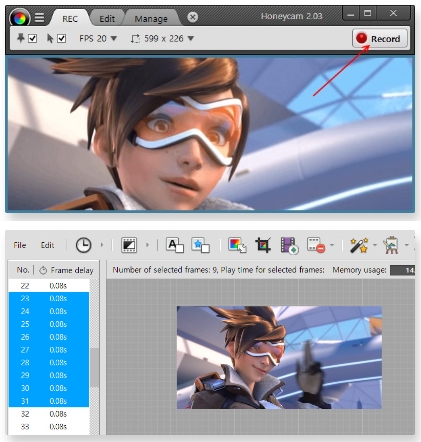 주요기능에 대해서도 말씀드리겠습니다. 녹화시작, 중지, 저장 이렇게 버튼을 세번만 클릭하면 간단하게 움짤을 만들 수 있습니다. GIF는 포맷 특성상 256 색상만 사용이 가능하지만, 꿀캠은 고품질 양자화 기능으로 고화질 움짤을 생성합니다.