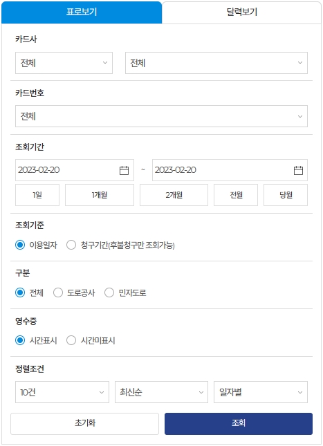 저는 공동인증서를 활용하여 로그인 해보았습니다. 카드사, 카드번호, 조회기간, 조회기준, 구분, 영수증, 정렬조건 등을 선택하고 [조회] 버튼을 누릅니다. 조회내역은 데이터 송수신 여건에 따라서 실제내역과 차이가 발생할 수 있으며, 카드등록 후 하이패스 사용내역 조회가 가능하고, 카드 등록안내를 참고해주세요.
