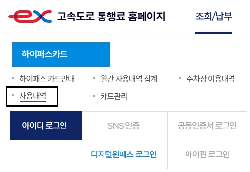 고속도로 통행료 홈페이지에 접속해서, 메인화면 상단에 있는 [조회/납부] 메뉴를 선택합니다. 그리고 하위항목들 중에서 [하이패스카드] 영역의 [사용내역] 항목으로 들어갑니다.