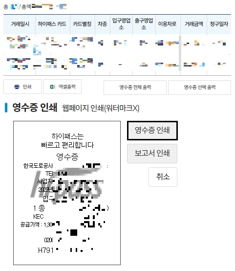 저도 최근 내역을 조회해보았는데요, 영수증은 전체출력을 하거나 원하는 내역에 대해서만 선택출력할 수 있습니다. 영수증에는 영업소명, 전화번호, 사업자번호, 사용일시, 입구영업소, 공급가액, 부가세 등의 정보가 적혀있습니다. 영수증 인쇄 및 보고서 인쇄를 할 수 있어요.
