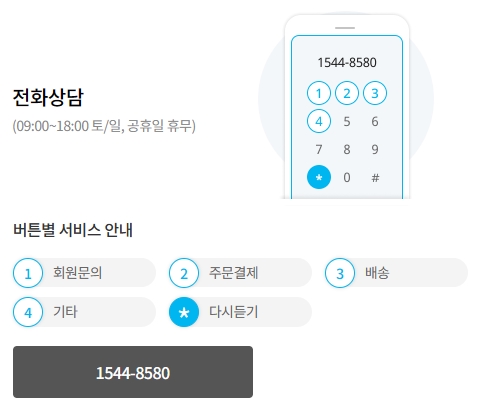 이용시간은 평일 09시 ~ 18시까지이고, 토요일과 일요일 및 공휴일은 휴무입니다. ARS는 1번 - 회원문의, 2번 - 주문결제, 3번 - 배송, 4번 - 기타, 별표 - 다시듣기입니다.