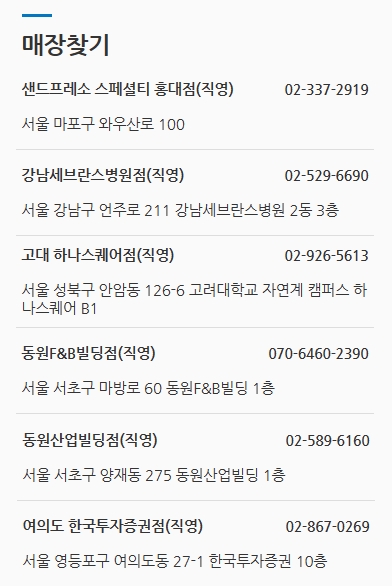 전국의 샌드프레소 매장이 어느정도 있는걸로 알고있는데요, 동원홈푸드 홈페이지에서 제공하는 매장정보에는 직영점 6곳만 안내되어 있습니다. 홍대점, 강남세브란스 병원점, 고대 하나스퀘어점, 동원F&B빌딩점, 동원산업빌딩점, 여의도 한국투자증권점이 있으며 각각에 대한 매장위치와 전화번호는 위의 그림을 참고하세요.