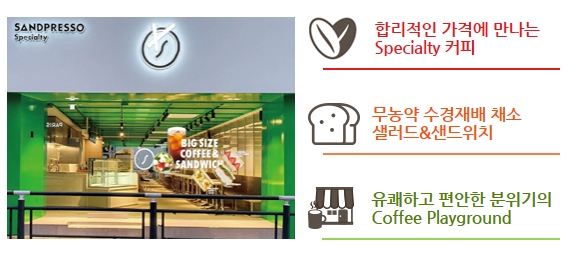 SANDPRESSO Specialty 또는 샌드프레소 스페셜티는 고품질의 Specialty 커피를 즐길 수 있는 카페 브랜드입니다. 엄선된 스페셜티 원두로 만든 커피를 합리적인 가격으로 제공하고, 무공해 수경재배 채소 청미채로 만든 건강한 샐러드와 맛있는 샌드위치를 유쾌하고 편안한 분위기에서 즐길 수 있는 Coffee Playground를 제공합니다.