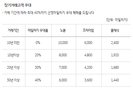 장기거래고객 우대혜택을 보시면, 거래기간에 따라서 최대 40%까지 선정마일리지 우대혜택을 드립니다. 거래기간이 길어질수록 마일리지 우대율이 높아집니다. 등급별 주요서비스는 아래 표를 참고하세요.