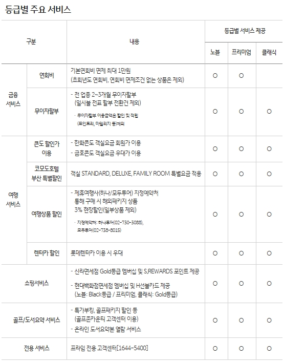 금융서비스는 연회비와 무이자할부, 여행서비스는 콘도 할인가 이용 / 코모도호텔 부산 특별할인 / 여행상품 할인 / 렌터카 할인, 그 외에 쇼핑서비스, 골프/도서요약 서비스, 전용 서비스가 있습니다.