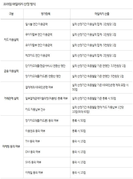 마일리지 산정방식은 위의 표를 참고하세요. 카드 이용실적, 금융 이용실적, 거래관계 실적, 마케팅 동의여부에 대하여 평가항목과 마일리지 산출방식을 확인할 수 있습니다.