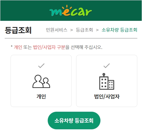 개인 또는 법인/사업자 구분을 선택하여 조회합니다. 개인소유의 경우 휴대폰을 통한 소유자 본인인증이 필요하고, 법인/사업자소유의 경우 법인등록번호 또는 사업자등록번호를 입력하여 조회할 수 있습니다. 회원으로 로그인 후 조회하면 차량상세정보가 제공되고, 자동차등급은 제작당시의 배출허용기준에 따라서 산정되며, 변경되지 않습니다. 산정된 등급은 운행중의 관리정도나 차량사용기간 및 자동차 종합검사 등과 관계없습니다.