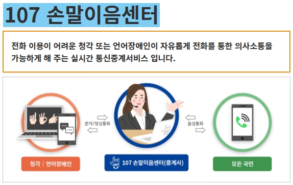 전화이용이 어려운 청각 및 언어장애인 고객의 상담불편해소를 위하여 운영하고 있습니다. 한국정보화진흥원이 운영하는 통신중계서비스이며, 청각 또는 언어장애인이 자유롭게 전화를 통한 의사소통이 가능하게 지원하는 실시간 전화중계서비스입니다.