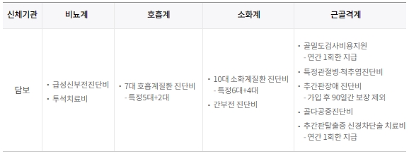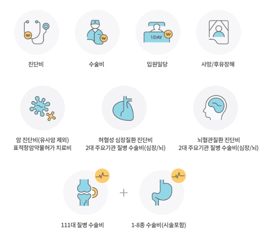 해당특약 가입시 111대질병수술비, 시술을 포함한 질병 1~8종 수술비를 보장합니다. 자세한 보장내용은 반드시 약관상 KCD진단코드를 확인해주세요. 해당특약 가입시 신체 기관별 다빈도 질환을 보장하며, 보장내용은 아래 표를 참고하세요.