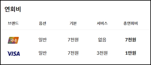 마지막으로는 연회비 정보를 보겠습니다. 연회비는 카드별 기본 연회비와 서비스 연회비를 합산하여 청구됩니다. 브랜드는 국내와 비자가 있으며, 국내의 경우 기본 7천원 및 서비스 0원으로 총 7천원이고, 비자의 경우 기본 7천원 및 서비스 3천원으로 총 1만원입니다.
