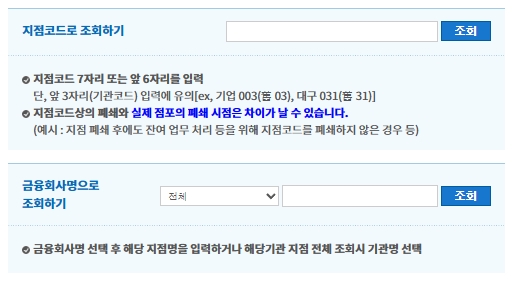 주소, 전화번호, 팩스번호가 틀린경우에는 은행이나 증권사 등 해당기관으로 문의하시기 바랍니다. 지점코드로 조회하는 경우, 지점코드 7자리 또는 앞 6자리를 입력합니다.