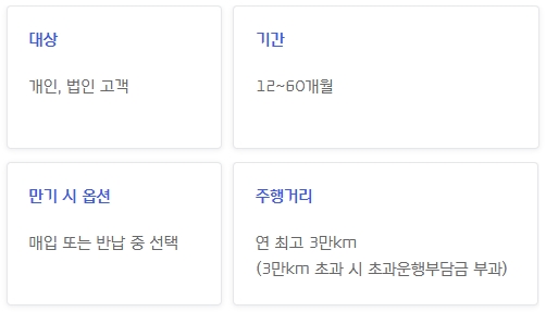 대상은 개인/법인, 기간은 12개월 ~ 60개월, 주행거리는 연 최고 3만km(초과시 비용발생)까지, 만기시에는 매입 또는 반납 중 선택할 수 있습니다.