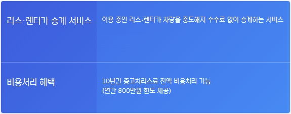 현대캐피탈 중고차리스 상품이용시 혜택 및 서비스로는, 이용중인 리스/렌터카 차량을 중도해지 수수료 없이 승계하는 서비스와 연간 800만원 한도로 10년간 중고차리스료 전액 비용처리 가능 혜택이 있습니다.