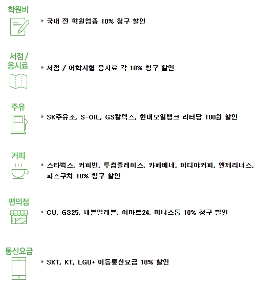 스타벅스, 커피빈, 투썸플레이스, 카페베네, 이디야커피, 엔제리너스, 파스쿠치, CU, GS25, 세븐일레븐, 이마트24, 미니스톱 이용시 10% 청구할인 혜택이 있습니다. 건당 5천원 이상 이용시 제공하고, 월 할인한도는 5천원입니다.
