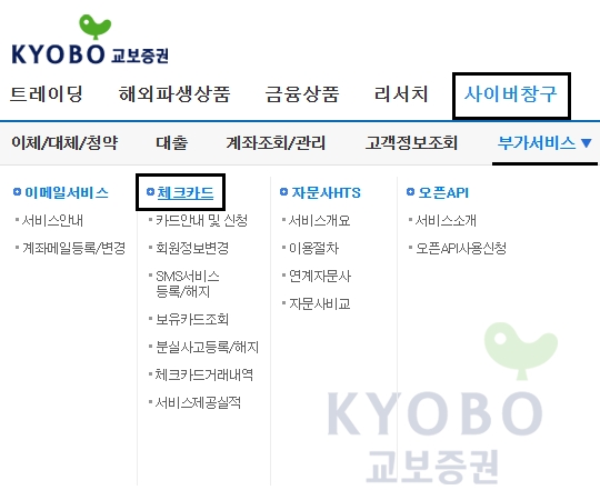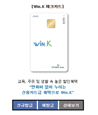 교보증권의 사이버창구 페이지에서 [부가서비스] 메뉴의 [체크카드] 항목을 선택하시면 Win.K 체크카드에 대한 안내를 확인할 수 있습니다.