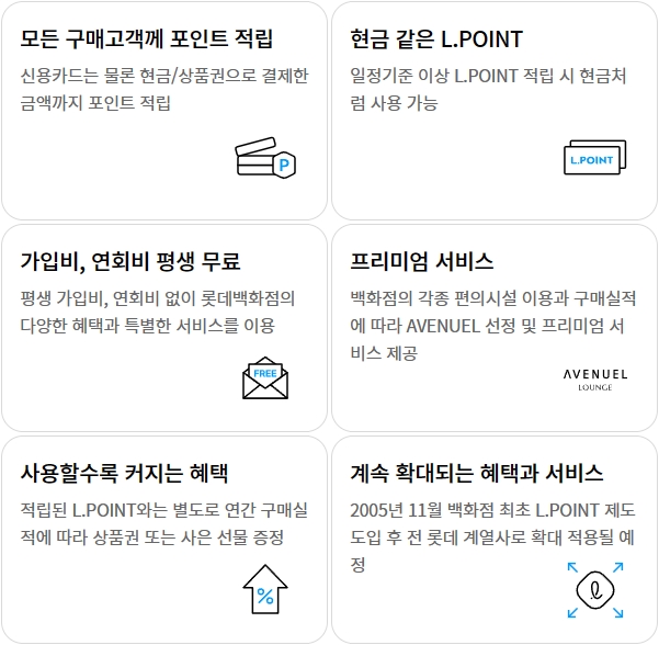 L.POINT 혜택 서비스로는 모든 구매고객에게 적립, 현금처럼 사용가능, 가입비와 연회비 평생무료, 프리미엄 서비스, 구매실적에 따른 혜택, 지속적으로 확대되는 혜택과 서비스가 있습니다.