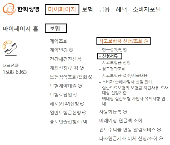 한화생명 소비자포털 페이지에 접속해서 [마이페이지] 메뉴로 들어가시면 [보험] 카테고리의 [사고보험금 신청/조회] 항목에서 한화 실비보험 청구서류와 청구방법 등에 대하여 확인할 수 있습니다. 실손은 입원과 통원으로 구분되어 있는데요, 먼저 공통서류부터 알아보겠습니다.