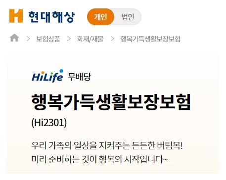 현대해상 홈페이지에 접속해서 [보험상품] 메뉴를 선택하고 [화재/재물] 영역에서 해당 상품을 확인할 수 있습니다. 우리가족의 일상을 지켜주는 든든한 버팀목이라고 하는데요, 미리 준비하는 것이 행복의 시작이라고도 합니다.
