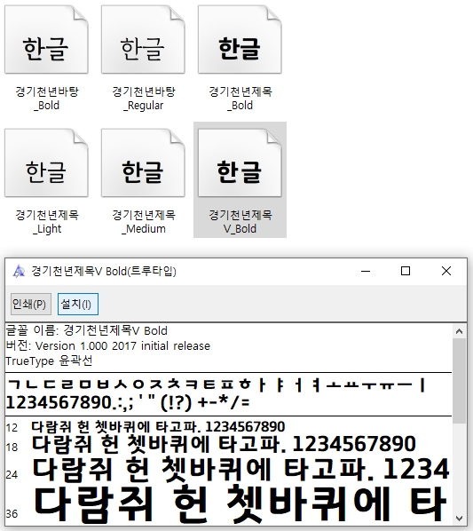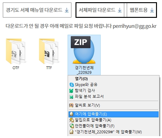 또는 다음의 페이지(경기도 서체 | 경기도 서체 | 경기도 상징물 | 경기도 소개 | 경기도청 - 변화의 중심 기회의 경기 (gg.go.kr))로 접속해주세요. 매뉴얼과 서체파일 및 웹폰트용을 다운받을 수 있으며, 압축파일을 풀어서 원하는 서체파일을 선택하여 설치할 수 있습니다.