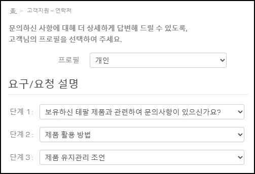 요구/요청 설명 부분에서는 1~3단계까지 선택할 수 있는데요, 고객의 개인정보를 입력하고 문의내용을 작성한 후 제출하시면 됩니다. 문의하기 전에 제품설명서 및 매뉴얼 페이지, 자주묻는질문 페이지, 보증 및 수리 페이지 등을 먼저 참고할 수 있습니다.