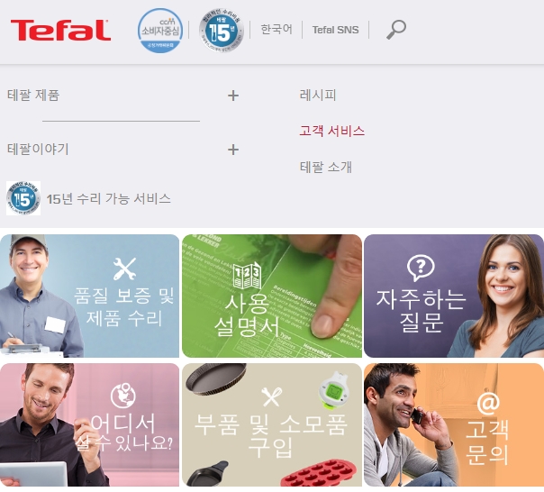 오늘은 테팔 고객센터 전화번호에 대하여 알아보고, 서비스센터를 찾는 방법도 알아보겠습니다. Tefal 홈페이지에 접속하여 메인화면 상단 좌측에 있는 [메뉴] 버튼을 선택하고 [고객 서비스] 항목으로 들어가시면 도움말을 확인할 수 있습니다.