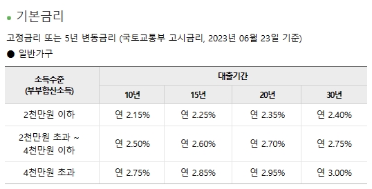 현재날짜 기준으로 기본금리 정보는 위의 표를 참고하세요. 고정금리 또는 5년 변동금리이며, 소득수준과 대출기간에 따른 금리를 확인할 수 있습니다. 조건 만족시 우대금리를 적용할 수 있는데요, 우대금리 적용 후 최종금리가 1.5% 미만인 경우에는 연 1.5%로 적용합니다.