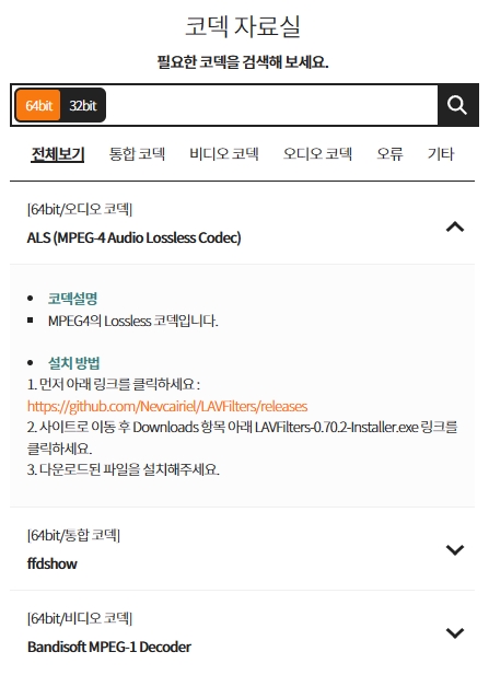 32비트 또는 64비트 중 선택할 수 있고 전체보기, 통합코덱, 비디오코덱, 오디오코덱, 오류, 기타 카테고리를 선택할 수 있습니다. 원하는 코덱을 선택하면 코덱설명과 설치방법을 확인할 수 있어요.