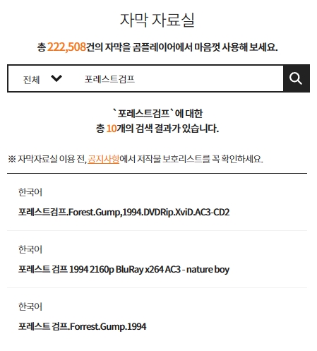 현재시간을 기준으로 총 222,500건 이상의 자막을 제공하고 있는데요, 원하는 자막파일을 찾아서 곰플레이어에서 마음껏 사용해볼 수 있다고 하네요.