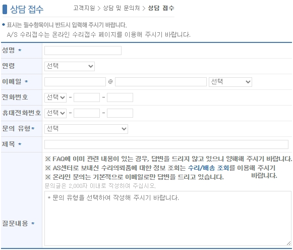 성명, 연령, 이메일주소, 전화번호, 휴대전화번호, 문의유형, 제목, 질문내용을 작성하여 제출합니다. 별표시가 되어있는 항목은 필수항목이기에 반드시 입력해주시고, A/S 수리접수는 온라인 수리접수 페이지를 이용해주세요.