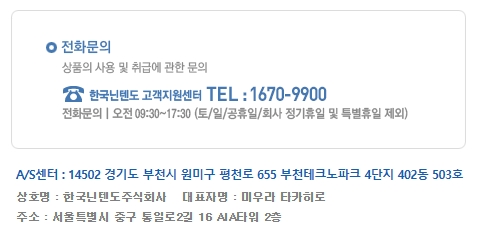 한국닌텐도 제품에 대한 전화 및 이메일 문의는 상담 및 문의처를 참고하시고, 온라인을 통한 제품구매를 원하시면 온라인 구입안내를 참고하세요.