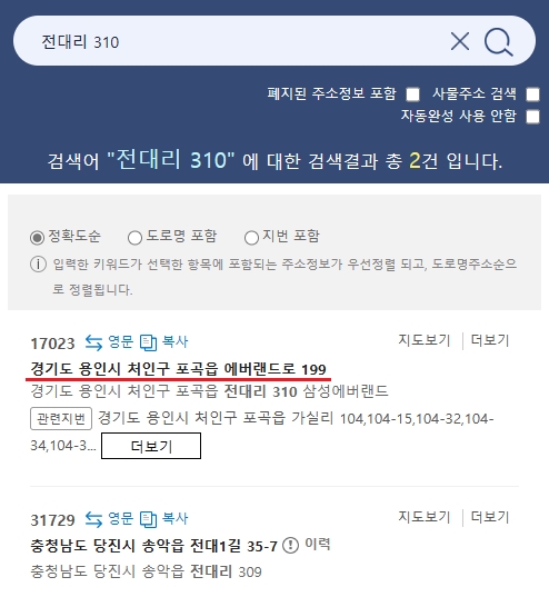 이번에는 에버랜드의 지번주소인 전대리 310을 입력하여 결과를 확인해보았습니다.