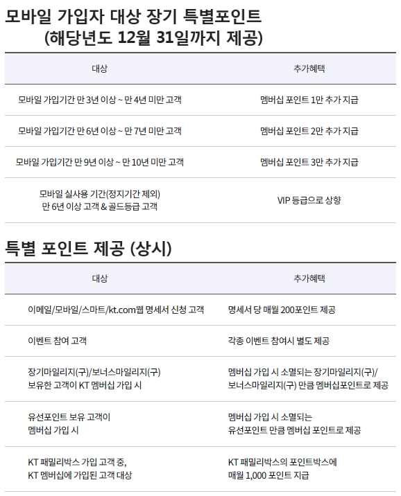멤버십 관련 주요 추가혜택으로는 해당연도 12월 31일까지 제공되는 모바일 가입자 대상 장기 특별포인트와 상시 제공되는 특별 포인트가 있으며, 대상 및 추가혜택 내용에 대해서는 위의 표를 참고하시기 바랍니다.