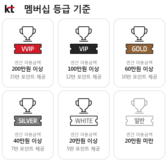 멤버십 등급은 KT 5대 상품인 모바일, 인터넷, IPTV, 집전화, 인터넷전화를 이용하시는 고객에게 제공하는 KT의 고객등급제도이며 연간 이용요금에 따라서 고객등급이 산정됩니다.