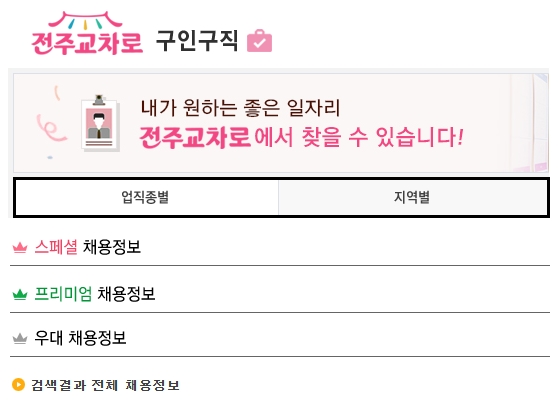 전주교차로 홈페이지(전주교차로 (gyocharo.com))에 접속하여, 메인화면 상단에 있는 [구인구직] 메뉴를 선택합니다. 내가 원하는 좋은 일자리를 찾을 수 있다고 하는데요, 업직종별 또는 지역별로 검색할 수 있어요.
