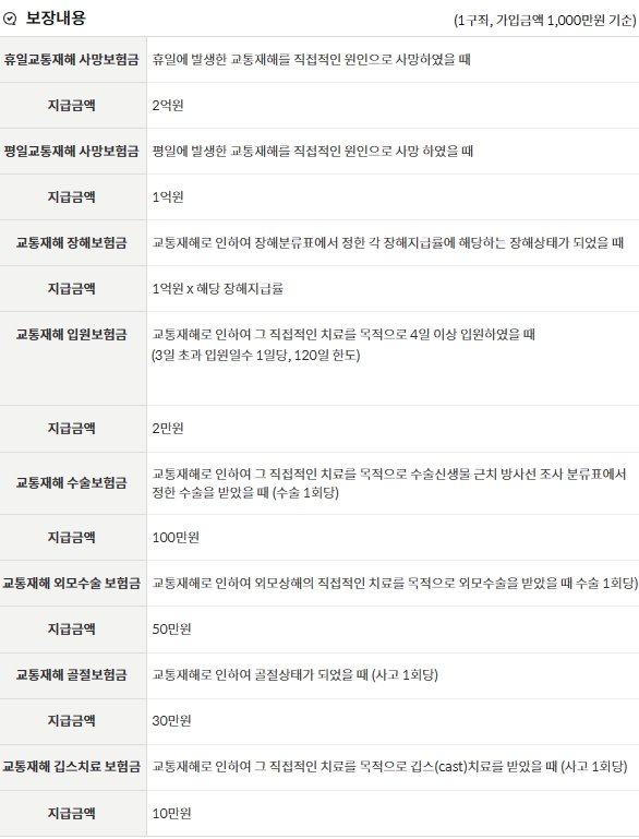 교통재해로 사망시 최고 2억원까지 보장하며, 교통재해로 장해시에도 최고 1억원까지 보장합니다. 또한, 주5일 근무제 및 레저문화 확산추세 등에 따라서 휴일교통 재해 사망 보장을 더욱 강화했다고 하네요.