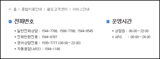 철도 고객센터 전화번호는 일반전화상담 1544-7788번 또는 1588-7788번 또는 1544-8545번, 전화반환전용 1544-8787번, 영어상담전용 1599-7777번, 자동응답 1544-1188번입니다.