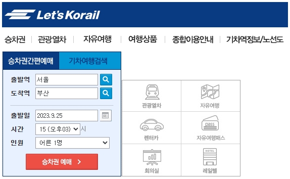 검색엔진이나 포털사이트 등을 활용하여 검색하거나, 레츠코레일 홈페이지 바로가기 링크( 레츠코레일-LetsKorail)를 통하여 접속할 수 있습니다. 승차권, 관광열차, 자유여행, 여행상품, 종합이용안내, 기차역정보/노선도 메뉴를 이용할 수 있으니 참고하세요.
