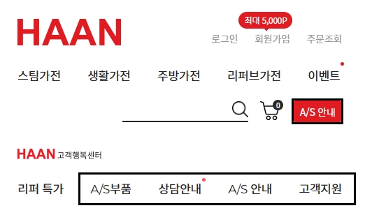 3. 고객행복센터 상담안내(한경희 브랜드 고객행복센터 (haanservice.com))에서 기기정보와 증상 접수