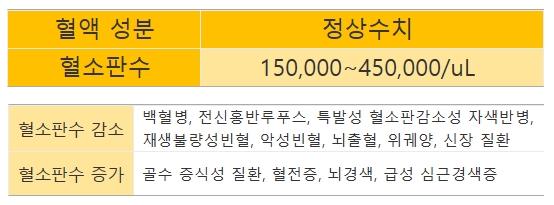 혈소판수가 감소하면 백혈병, 전신홍반루푸스, 특발성 혈소판감소성 자색반병, 재생불량성빈혈, 악성빈혈, 뇌출혈, 위궤양, 신장질환이 발생할 수 있습니다. 혈소판수가 증가하면 골수 증식성 질환, 혈전증, 뇌경색, 급성 심근경색증이 발생할 수 있습니다.