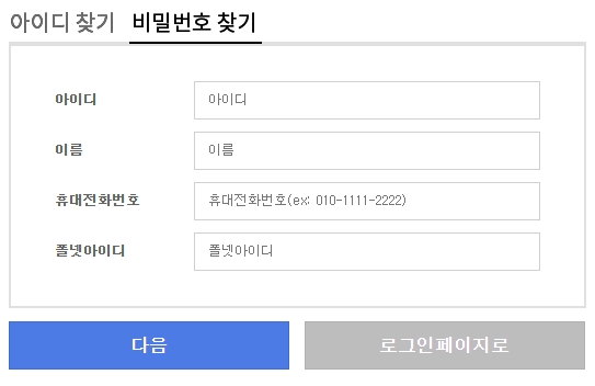 비밀번호를 분실한 경우에는 [비밀번호 초기화] 버튼을 눌러서 [비밀번호 찾기] 페이지를 열람할 수 있습니다. 아이디, 이름, 휴대전화번호, 폴넷아이디를 입력하고 [다음] 버튼을 눌러서 찾아주시면 됩니다.