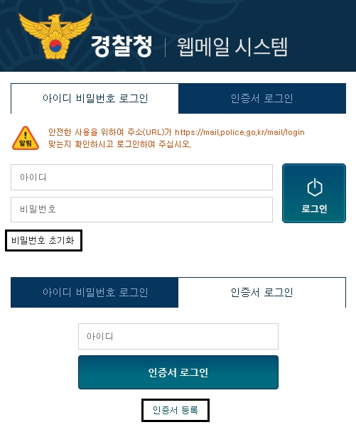 해당 사이트 로그인 페이지(경찰청 웹메일 | 로그인 (police.go.kr))에 접속하여 아이디와 비밀번호 또는 인증서 로그인을 할 수 있습니다. 안전한 사용을 위하여 사이트 주소가 제대로 맞는지 확인하고 로그인 하라는 주의문구가 적혀있습니다.