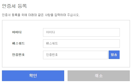 인증서 로그인시 미등록 되어있다면 [인증서 등록] 버튼을 눌러서 해당 페이지를 열람할 수 있습니다. 아이디, 패스워드, 인증번호를 입력하고 [확인] 버튼을 눌러서 등록하시면 됩니다.